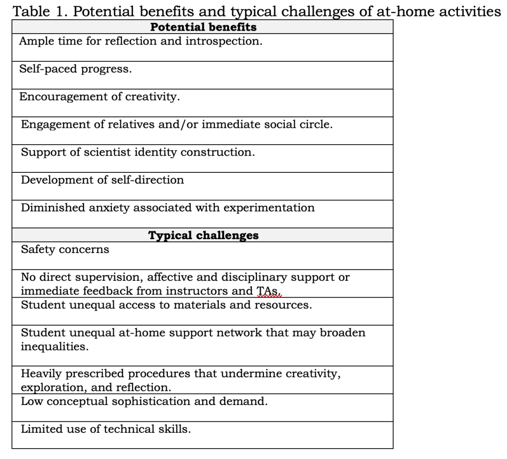 Experimentation activities away from the laboratory facilities. Pre-Covid, we explored the use of experimentation activities away from the laboratory facilities. We envisioned this approach would potentially provide an environment where students could be more reflective of their own work and learning and be more creative. Experimental activities away from the laboratory potentially alleviate some of the chemistry anxiety and work as induction to experimentation in the affective dimension, Table 1. shows benefits and challenges we considered for the selection and design of the activities. Four pillars guided the design of these activities: (1) safety, (2) exclusive use of household materials, (3) green chemistry principles, and (4) access to an authentic experimentation experience.